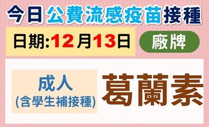 114年12月13日假日加開流感疫苗門診廠牌公告說明。 臺中市烏日區衛生所 2025-12-12 114年12月13日假日加開流感疫苗門診廠牌:葛蘭素 ★假日加開門診因民眾接種人潮較多,現場人力需全數投入接種及引導作業,故無法同時提供電話諮詢服務,造成不便,敬請見諒★