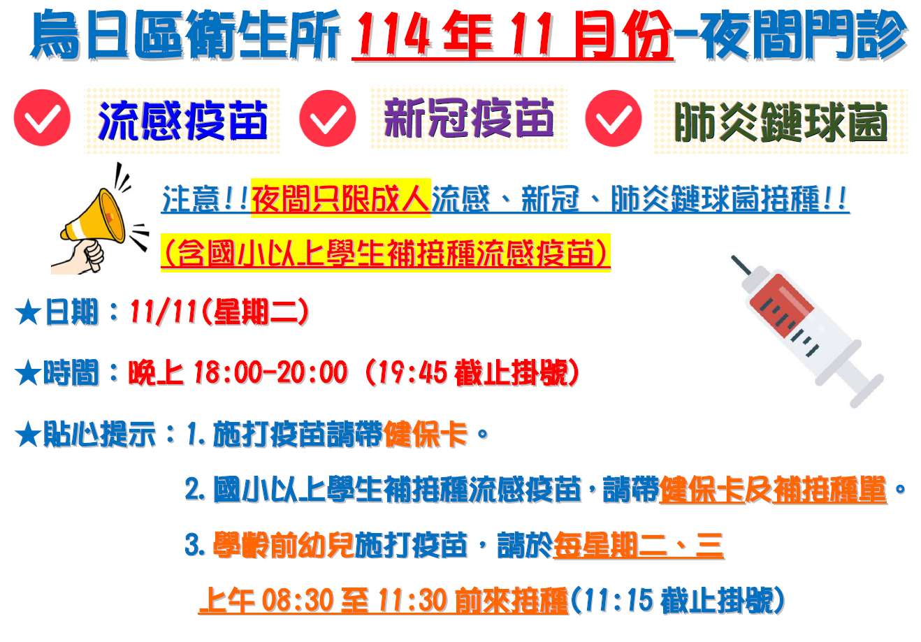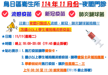 為方便民眾接種疫苗,本所於11月份加開夜間流感、新冠疫苗及肺炎鏈球菌接種門診(夜間只提供成人接種及國小以上學童補接種流感疫苗)