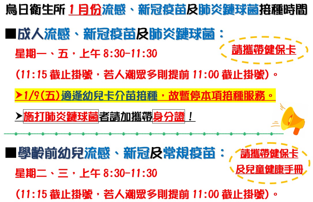 1月9日(五)適逢幼兒卡介苗接種,故暫停流感、新冠疫苗及肺炎鏈球菌接種服務。